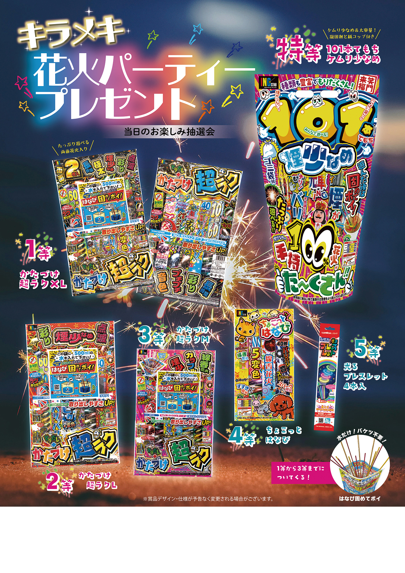 - 特等:101本てもちケムリ少なめ×1コ・1等:かたづけ超らくらくXL×2コ・2等:かたづけ超らくらくL×3コ・3等:かたづけ超らくらくM×6コ・4等:ちょこっとはなび×8コ・5等:光るブレスレット4本入×80コ/A3ポスター/抽選箱/くじ100枚/くじ明細書/店頭用お知らせPOP2枚