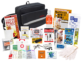 - 収納バッグ・防災の心得・IDホイッスル&カラビナリング・カイロ・レインコート・携帯用トイレ・FMラジオ・軍手・発光スティック・モバイルバッテリー(乾電池式)・静音アルミブランケット・防災てぬぐい・マスク・7年保存水500ml・バランススティック×2・8徳ナイフ・緊急避難カード・除菌アルコールウェットティッシュ・水に流せるペーパー・救急4点セット・避難用ヘッドカバー